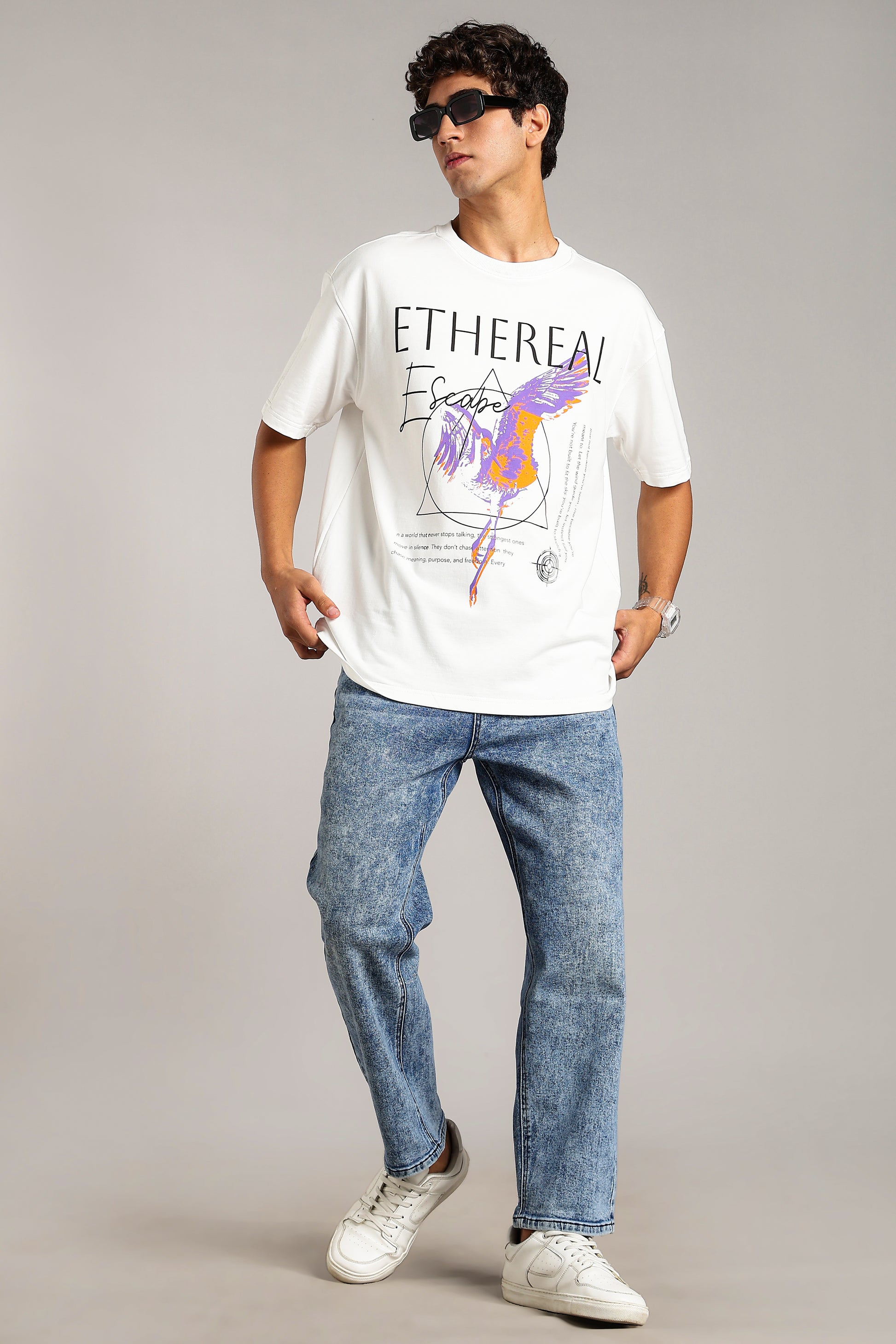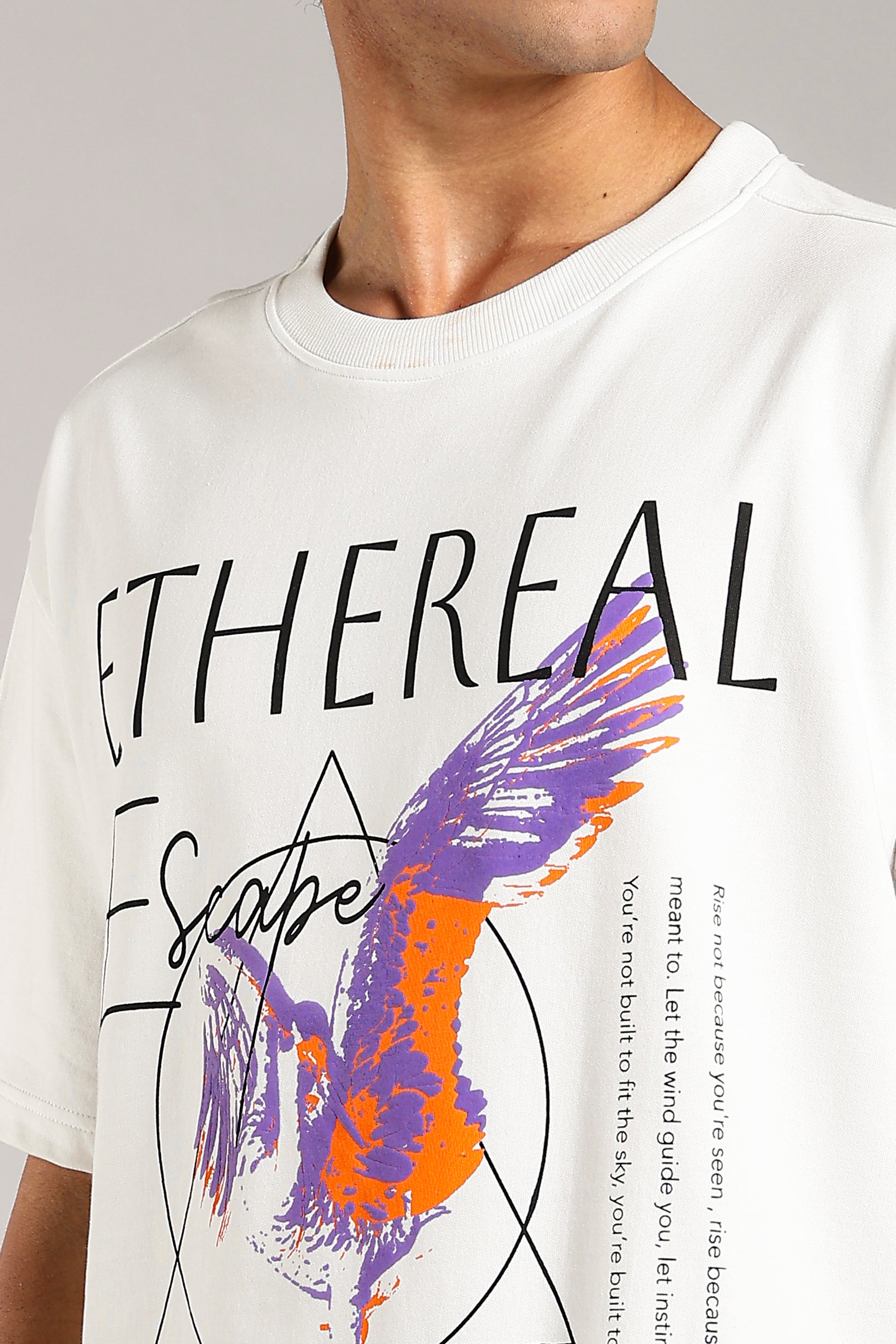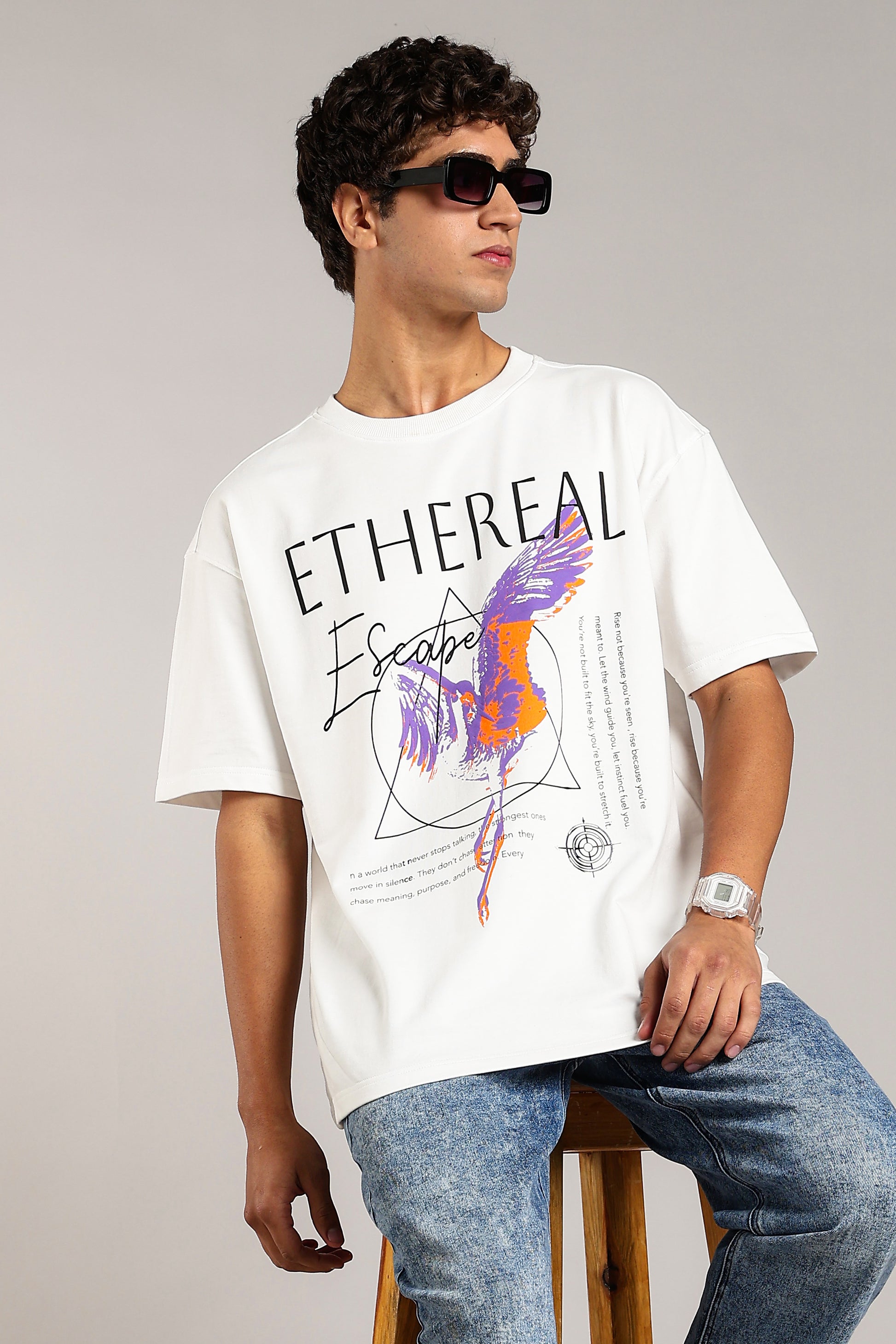 Oversized white drop-shoulder T-shirt featuring a premium HD “Ethereal” print. Designed for bold comfort and everyday street style.