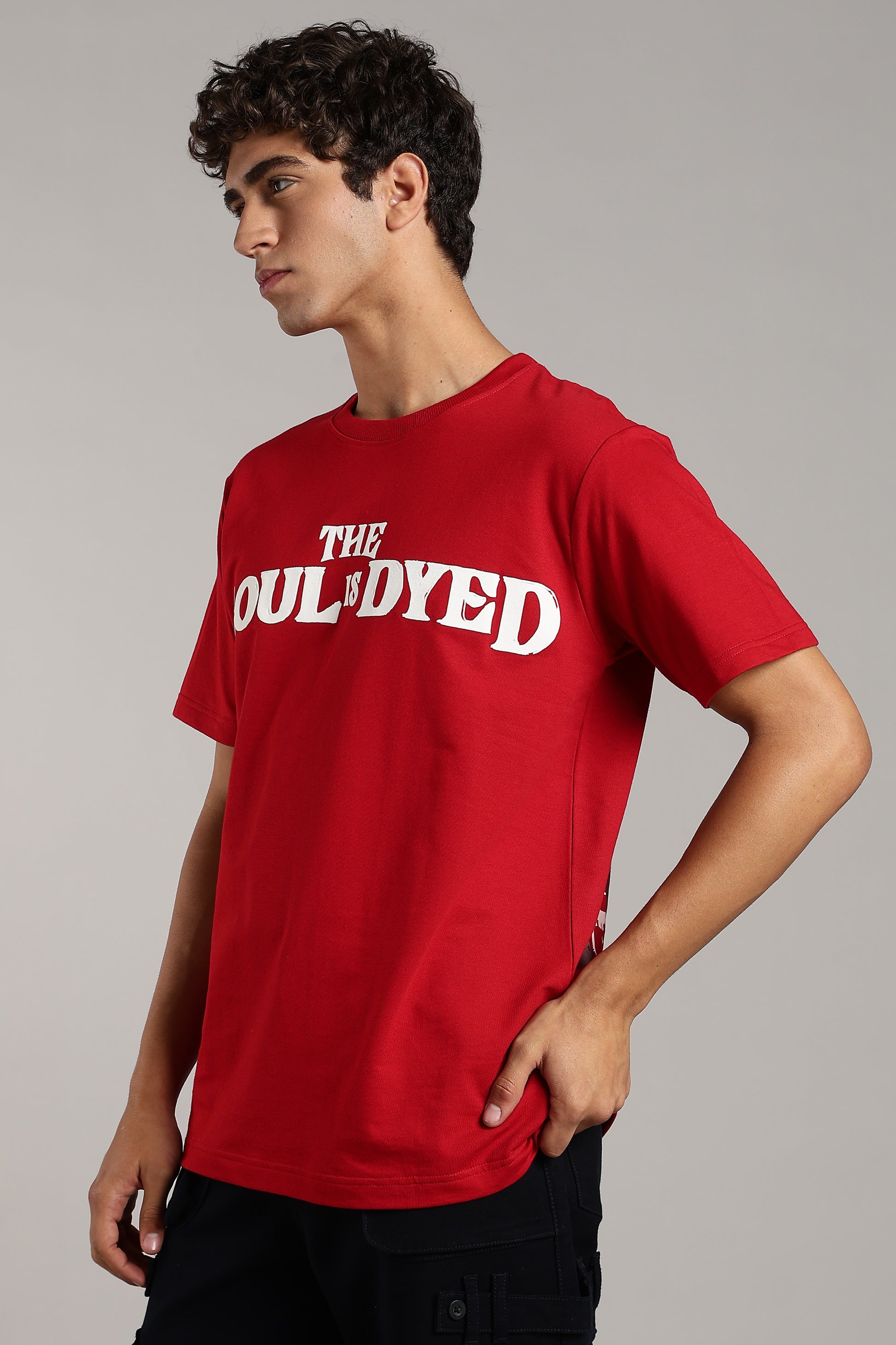 Premium red regular-fit T-shirt crafted in 240 GSM cotton with bold puff-printed “Soul Is Dyed” design. Strong, clean, and timeless.